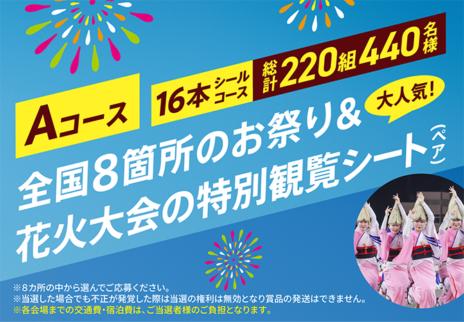 ※期間中であればお一人様何度でもご応募いただけますが、Aコース(16本シールコース)のご当選は1つのお祭り・花火大会につき、おひとり様1回まで、Bコース(8本シールコース)のご当選は1回までとさせていただきます。ご当選後は同一賞品への応募が不可となります。